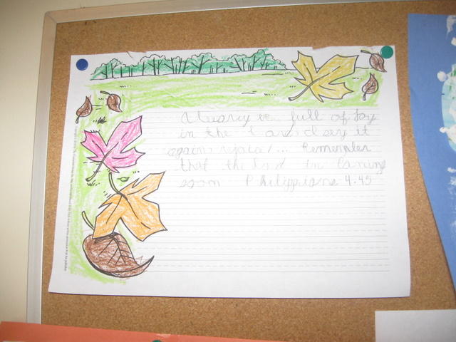 Then the real fun begins. 🙂 The second section of the book contains 32 weeks of lessons, each featuring a Bible verse. Days 1 through 3 of each week’s lesson contain individual practice words from the verse. Day 4 is tracing the verse, while Day 5 is writing the verse out on a piece of handwriting paper with a decorative border (the border paper is provided in the back of the workbook). I assign Miss M cursive practice every day, and occasionally I have her “double up” somewhere in days 1 through 3 or skip the tracing day if we don’t have five full/regular school days in a particular week.