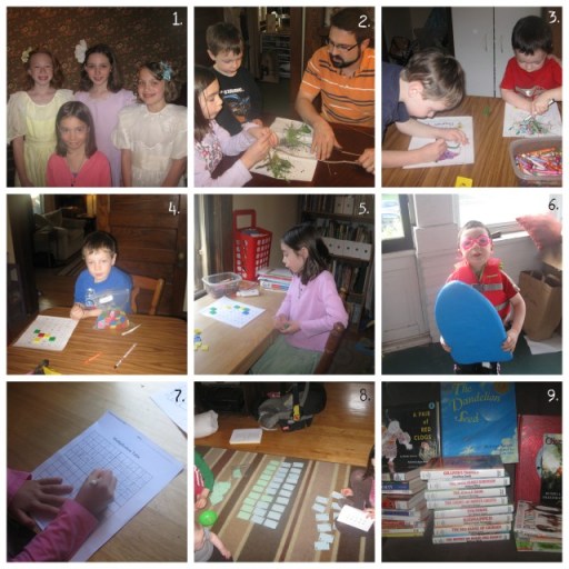 9. This was possibly my highlight of the week…a trip to my favorite semi-annual library book sale in a suburb about 20 minutes from our house. I picked up all the books in the picture (plus a big book on the history of Minneapolis that I missed adding to the pile…that one is for me) for only $10.50! Miss M also picked out about two dozen books that only cost her about $4 of her “book money”. I was hoping for more titles related to our American history studies next year, but I was happy with some Great Illustrated Classics and other chapter books that I hope will appeal to the boys in the next couple of years, a couple picture books, and a few read-alouds to enjoy with Miss M along with the couple history titles I did find.