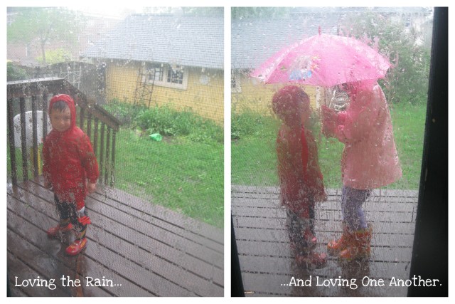 We’ve had a lot of rain the past several days. On Thursday, the first rainy day, the rain showers hit just as we were coming home from an appointment at the clinic for baby J. As much as the practical side of me wanted to keep the kids inside, I let them head out in the rain to play: