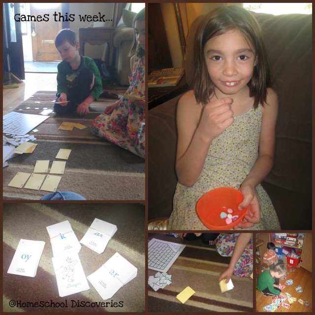 We played games for quite a while on both Wednesday and Thursday (and maybe we’ll do that today too — we’ll see how things go!).  The highlight of our game playing for the kids probably a game I created that they named “Phonogram Treats.”   I showed the kids Logic of English (LOE) phonogram flashcards, and they got a piece of candy for saying all the sounds of the given phonogram correctly.  We cheered on the three-year-old, Mr. K, for saying anything remotely close to a correct sound or letter name and made sure that with enough hints, he ended the game with plenty of candy in his bowl too. We also played a Logic of English game called Dragon from the LOE games book. Mr. E chose not to play with us and Miss M and we found this game was not quite so fun with only two players — but at least it was good practice.