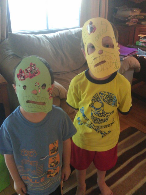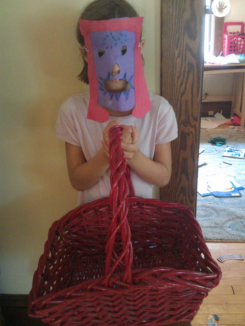 After listening to the book today, the boys, completely on their own, decided to make masks that were loosely inspired by the masks they saw in the book.  All I had to do was cut the small mouth holes and tie on the elastic strings.  And not to be outdone, Miss M had to make one too once she saw the boys’ masks (she’s holding a basket because she is the “basket lady” in the book):