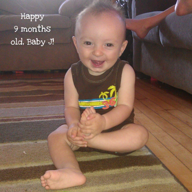 Finally, Baby J gets the gold medal for “Most improved at Locomotion”.  🙂  We wished Baby J a happy Nine Months Old on Monday.  While he isn’t crawling yet, he certainly qualifies as “mobile.”  This week he became proficient enough at scooting on his bottom to move from room to room, pull books off the book shelves, attempt to chew on cords, and discover the joy of pulling plastic bowls out of the drawer.   Let the selective baby-proofing and teaching-of-“no touch” begin!