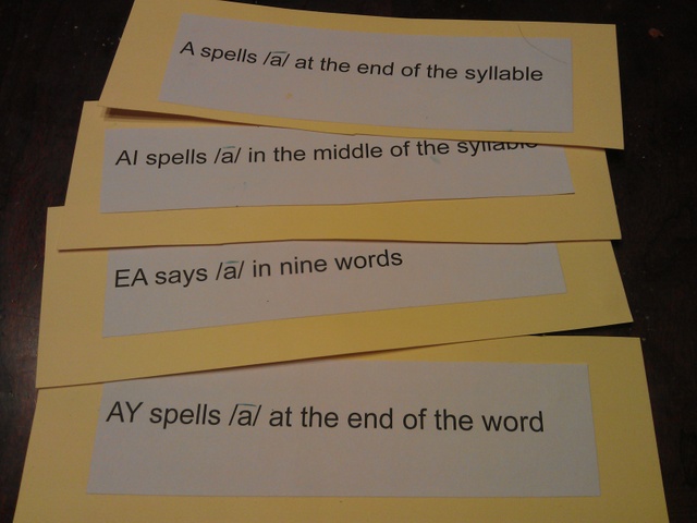 I did make up my own game to practice choosing long A sounds. I created cards for the various ways of spelling the /long A/ sound that we studied in lesson 4: