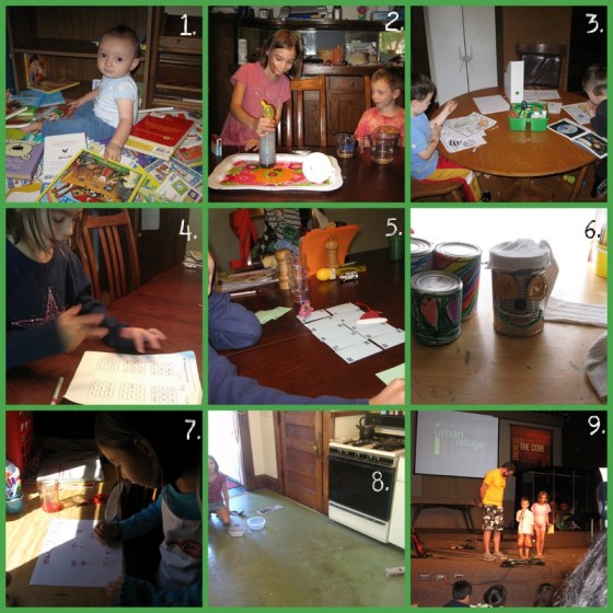 2. Miss M wanted to be a “mad scientist”, and put on a “show” for us involving science demonstrations she had seen at a birthday party. Not to be outdone, Mr. E also made a great concoction that ended up looking at bit like a slimy green volcano.