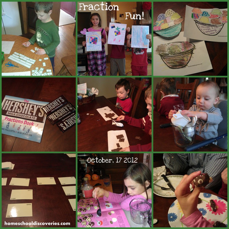 After the art work I treated the kids to a fraction-related snack — Hershey chocolate bars! We worked through the Hershey Fractions Book together and the kids made the various fractions found in the book (and other fun designs).  After reading just a bit about the ingredients of a chocolate bar in the book, we just had to learn more about chocolate making! This video and this video from youtube were very informative! We also discussed ways we use fractions in everyday life: cooking, time money, etc (baby J thought the measuring cups were great fun to play with!).