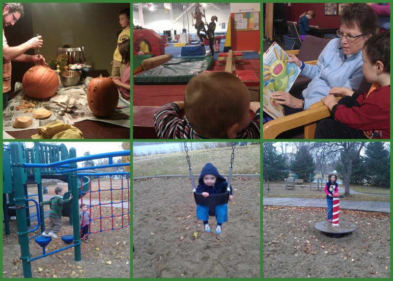 Upper Middle/Right: Miss M and Mr. E are taking a weekly homeschool gymnastics class. We’ve done it for seven weeks with five more to go. Baby J really enjoys watching the kids. 🙂 This week Grandma Karen was visiting for a couple hours on gymnastics day, so she came along to watch (and read to Mr. K, who is just a bit too young for the class, unfortunately!). This week the gym was decorated for Halloween (Notice Miss M on the “witch swing”!).