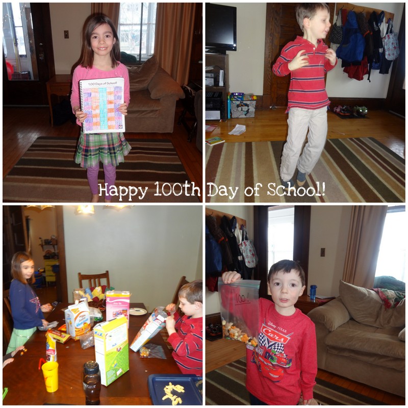 I took some ideas from my post earlier this week to fill our “100th day of school” morning. The kids favorite activity was making a “100 Snack” (10 each of 10 snack items). I think their second favorite was guessing how many of various activities they could do in 100 seconds, then trying that out (how many times to jump up and down, count to 10, say the alphabet, etc).