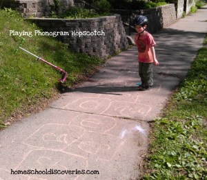 I bought the optional, but very useful, Phonogram and Spelling Game Book as well.  Not every lesson incorporates games, but if you have a younger learner or a learner who finds games to be a very useful method of study having the game book will be very useful in finding additional ways to practice.  The book features card games, paper games (like bingo), games that could be played with a chalk/dry erase board and active games for learning while playing something like hopscotch.  I like the fact that the games can easily be tailored to multiple ability levels.  I expect Miss M to know all the sounds a phonogram makes, I allow Mr. E some leeway to remember “most” of the sounds (as a five-year-old it is taking him a bit longer to remember all the sounds for some of the phonograms that have three or four sounds!) and I can even include Mr. K at times as he is beginning to learn the names of letters and perhaps one sound that each letter makes.